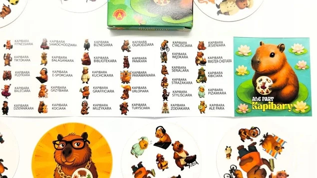 Ale Pary – Kapibary to szybka i prosta gra towarzyska, w której każda z 31 kart przedstawia kapibary w codziennych (i niecodziennych!) odsłonach: jako baleciarę, muzykarę, biznesiarę, ogrodziarę, fitnessiarę, a nawet… kapibarę samochodziarę! Dwie dowolne karty zawsze mają jeden wspólny obrazek – choć ukryty może być sprytnie, bo różni się wielkością lub pozycją.