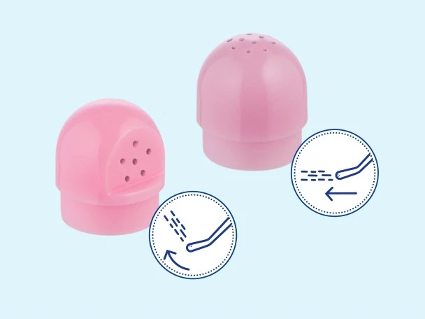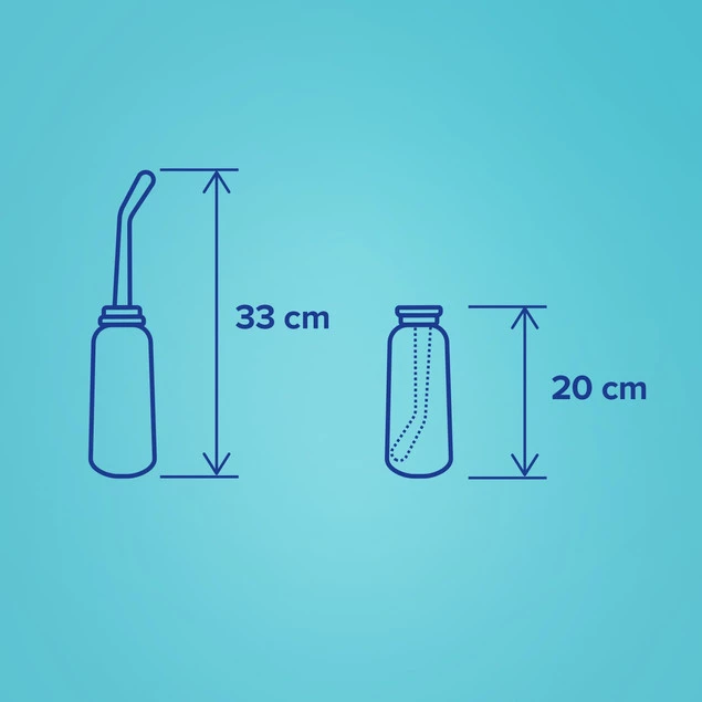 ![]() | 2 końcówki z różnym kątem strumienia wody Odwrócona butelka z szyjką o długości 17 cm po ściśnięciu uwalnia strumień wody pod wybranym kątem. Ułatwia podmywanie się i dotarcie do trudno dostępnych miejsc bez schylania się lub w ciąży, gdy brzuszek utrudnia czynności higieniczne. |