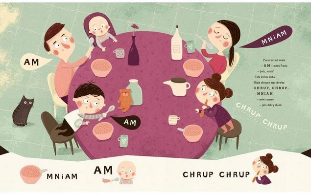 Ta pozycja jest kolejną z serii "Uczę się mówić", jej celem jest nauka wymowy samogłosek i wyrażeń dźwiękonaśladowczych. Przeznaczona jest szczególnie dla najmłodszych dzieci lub dla tych, których rozwój mowy jest opóźniony. Bogate ilustracje, wykonane przez Joannę Kłos, są przyjazne w odbiorze i perfekcyjnie odzwierciedlają treść.