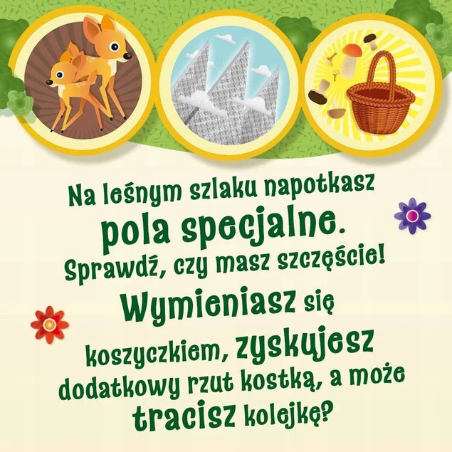 poruszają się pionkami po leśnej trasie zgodnie z wynikiem rzutu kostką,