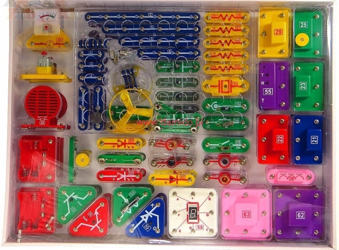 Podczas zabawy poznasz: działanie silnika, przełączników, źródeł dźwięku i światła, modułów dźwiękowych i radiowych MW i UKF, rezystorów, kondensatorów, tyrystorów, rejestratorów dźwięków, wyświetlaczy cyfrowych, itp. Oddajemy w Twoje ręce zestaw ponad 1200 elementów, który pozwoli dzieciom poznać świat elektroniki i elektrotechniki. Zajmujące i stymulujące wyobraźnię doświadczenia gwarantują wiele godzin wspaniałej zabawy a jednocześnie pozwolą na poznanie zasad działania układów elektronicznych. W prosty i bezpieczny sposób na płycie montażowej można zestawić różne układy elektroniczne sterowane: magnesem, wodą, dotykiem, dźwiękiem i światłem. Efektem takich działań będą: błyskające żarówki, latające śmigła, wentylatory napędzane silnikiem i wiele innych fantastycznych efektów dźwiękowych. Wszystkie elementy zostały zaprojektowane tak, aby bezproblemowo i bezpiecznie połączyć za pomocą zaciskanych złączek. Przyjemne z pożytecznym, czyli nauka poprzez zabawę. Dzieci zapoznają się z tajnikami budowy obwodów elektronicznych i na pewno będą zdumione wynikami samodzielnie przeprowadzonych doświadczeń. Starsze dzieciaczki mogą w jeszcze większym zaangażowaniem pogłębić i poszerzać swoją wiedzę oraz rozwijać wyobraźnię tworząc własne, zaprojektowane przez siebie układy.
