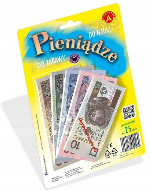 • Zestaw sztucznych banknotów Alexander do zabawy i nauki liczenia. 125 papierowych złotówek (10, 20, 50, 100 i 200 zł) idealnych do zabawy w sklep, ćwiczenia liczenia pieniędzy i wydawania reszty dla dzieci od 3 lat.