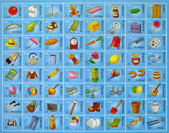 W tej grze zasady są bardzo podobne. Otrzymujemy do dyspozycji plansze z rysunkami towarów i wypisaną ceną oraz zestaw banknotów i monet imitujących prawdziwe pieniądze.