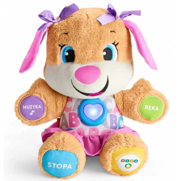 Śliczna Siostrzyczka szczeniaczka skradnie serce Twojej pociechy i stanie się wierną towarzyszką jej zabaw. Poziomy nauki pozwolą dopasować wartości edukacyjne do wieku i etapu rozwoju Twojego dziecka. Nim się obejrzysz Twój skarb pokona wszystkie trzy poziomy nauki i zaskoczy Cię nowymi umiejętnościami. W pierwszym etapie dziecko naciska na łapki, stópkę, serce lub uszko swojej towarzyszki i poznaje alfabet, pierwsze słowa, nazwy kolorów, części ciała i nie tylko! Po przejściu na kolejny poziom mały odkrywca usłyszy radosne wypowiedzi, które zachęca go do wspólnej nauki. To pora na wspólne liczenie, odnajdywanie kolorów i wskazywanie na części ciała. Trzeci, ostatni etap to kreatywna przygoda. Tu zabawa opiera się na naśladowaniu. Wspólne śpiewanie z Siostrzyczką rozbudza wyobraźnie malca i zachęca do odgrywania ról, co znacząco rozbudowuje zasób jego słownictwa. Zaśpiewajcie z nią znana piosenkę o małych pieskach i zobaczcie jak jej serduszko pulsuje tęczą barw w rytm muzyki!