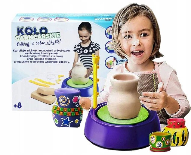 Koło garncarskie pozwala dziecku na twórczą zabawę. Kształtuje zdolności manualne i artystyczne, poczucie estetyki, wyobraźnię i kreatywność, koordynację zmysłowo - ruchową oraz logiczne myślenie..