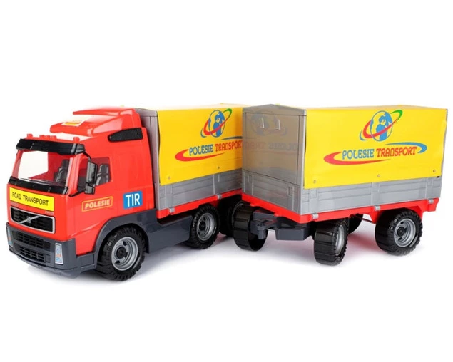 Samochód z plandeką i przyczepą VOLVO to duża ciężarówka wyposażona w szerokie koła połączone metalowymi osiami. Ich struktura nie jest gładka, co ułatwia jazdę po nierównych powierzchniach. Posiada naczepę oraz dołączoną do niej przyczepę. Na jednej i drugiej umieszczono stelaż z plandeką. Burty naczepy oraz przyczepy można otworzyć, a plandekę unieść do góry. Kabina kierowcy jest oszklona. Użyto w tym celu grubego, przezroczystego plastiku.