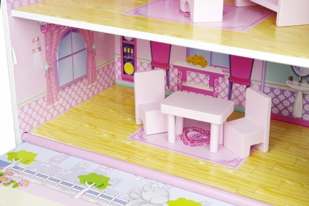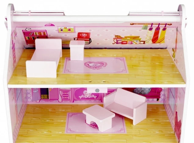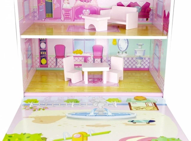 Śliczny, Duży DREWNIANY DOMEK NORIMPEX to spełnienie marzeń każdej dziewczynki. W dwupiętrowej rezydencji z poddaszem i jej gustownie urządzonych wnętrzach, zakochają się od pierwszego wejrzenia! Każdy szczegół jest tutaj precyzyjnie dopasowany i wszystko idealnie się ze sobą komponuje. Przestronne wnętrza i ich utrzymana w różowej tonacji kolorystyka spełnią wymagania najbardziej wymagającej właścicielki. Przepiękna, składająca się z trzech dużych pomieszczeń, kompleksowo umeblowana rezydencja będzie idealnym miejscem do zamieszkania przez ukochaną lalę Twojej pociechy. Gustowny budynek zachwyca dopracowanymi w najdrobniejszych szczegółach detalami i pięknymi, starannie wykonanymi mebelkami.
