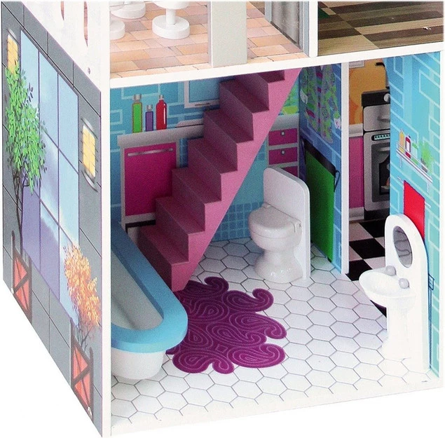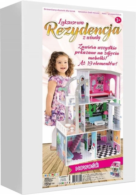 Fantastyczny, Duży DREWNIANY DOMEK DLA LALEK NORIMPEX będzie ulubionym miejscem zabaw Twojej młodej damy. Meblowanie poszczególnych pomieszczeń i tworzenie fantastycznych historyjek w przepięknych wnętrzach rezydencji, zapewni dziecku wciągające zajęcie na bardzo długi czas. Takiego uroczego domku można tylko lalce pozazdrościć! Wysoka na 112 cm konstrukcja urzeka nowoczesnymi wnętrzami i wystrojem, które dają poczucie luksusu. Trzy piętra domku składają się z czterech, przestronnych pomieszczeń i aż 2 tarasów. Dekoracje i detale każdego z pokoi ściśle odzwierciedlają jego przeznaczenie. Nowe lokatorki znajdą tu gustowną kuchnię, łazienkę z wanną, elegancki, połączony z balkonem salon i przytulną sypialnię, z fantastycznym, wyłożonym szarymi płytkami i otoczonym przezroczystą balustradą tarasem. Przemieszczanie pomiędzy poziomami umożliwia winda i łączące parter z pierwszym piętrem schody. Z przestronny, stabilnym, bajecznie kolorowym Dużym DREWNIANYM DOMKIEM dla lalek NORIMPEX na małą właścicielkę czeka mnóstwo frajdy i wspaniałej zabawy! Wysoka jakość wykonania jest gwarancją długiego i bezpiecznego użytkowania. Zestaw do samodzielnego złożenia i skręcenia za pomocą dołączonych śrub.