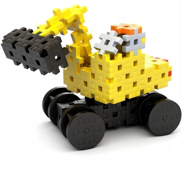 W opakowaniu klocki w sześciu kolorach z przewagą ostrzegawczej żółtej barwy, która przypomina, że to pojazdy konieczne na budowie.
