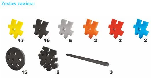 Poza standardowymi płaskimi elementami zestawy wzbogacono w części konieczne do konstruowania pojazdów – takie jak np. osie i koła.