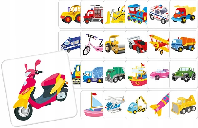 - 48 kartoników z 24 parami obrazków przedstawiających pojazdy