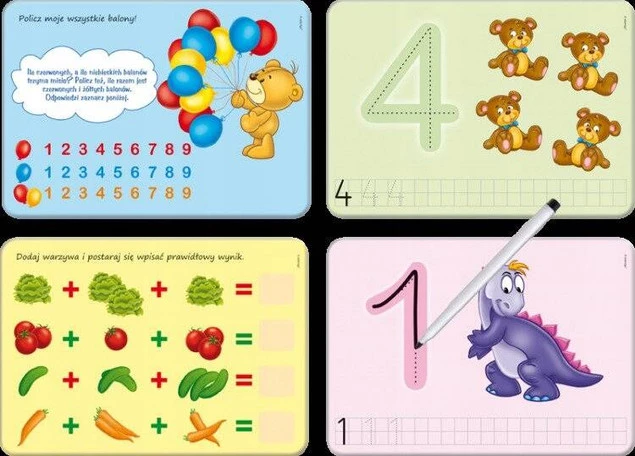 Z wyjątkowym zestawem od ADAMIGO Twój mały przedszkolak otworzy drzwi do fascynującego świata cyferek opanuje sztukę liczenia. Do wspólnej zabawy zaprosi dziecko przesympatyczny Miś, który nie może się już doczekać, by nauczyć Twój mały skarb nowych umiejętności. Z tak uroczym przyjacielem maluszek chętnie podejmie wyzwanie, a ćwiczenia sprawią mu radość. Zadania dla małego przedszkolaka umieszczone są na 16 dwustronnych tablicach, na których dziecko będzie pisało specjalnym, suchościeralnym markerem. Karty składają się z linijek, w których malec będzie mógł trenować nowe umiejętności.