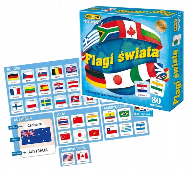 Gra "Adamigo Memory" jest doskonałą grą towarzyską dla wszystkich lubiących dobrą zabawę w wesołym klimacie. Rozwija pamięć, uczy koncentracji, zbliża rodzinę i uprzyjemnia wolne chwile. Tym razem młody gracz ma okazję zapoznać się z wyglądem aż 40 flag różnych państw z całego świata.