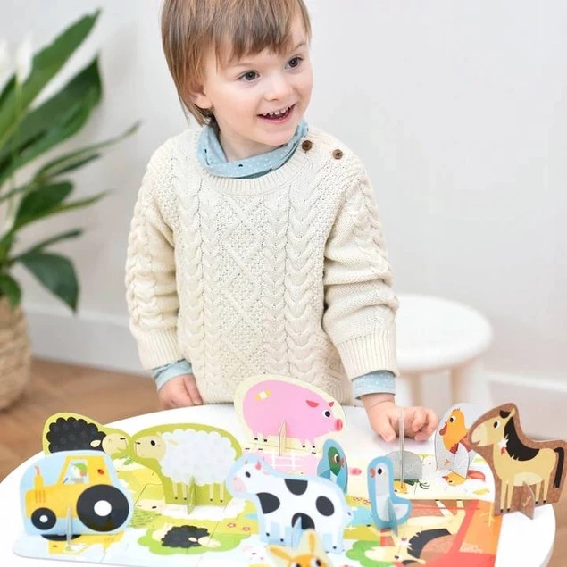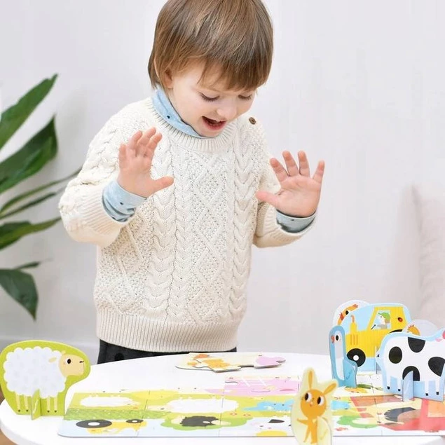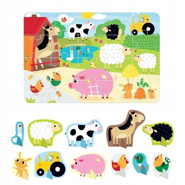 Dwulatek jest uważnym obserwatorem otaczającego go świata. Codziennie poznaje nowe słowa i staje się coraz bardziej samodzielny. Ale puzzle W gospodarstwie rozwijają małą i dużą motorykę, spostrzegawczość i wyobraźnię. To także wesoła lekcja nowych słów.