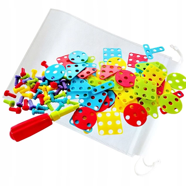 Przykręcanie kolorowych śrubek wymaga precyzji ruchów ręki - zabawka usprawni motorykę małą, pozwoli opanować chwyt pisarski oraz rozwinie umiejętności grafomotoryczne.