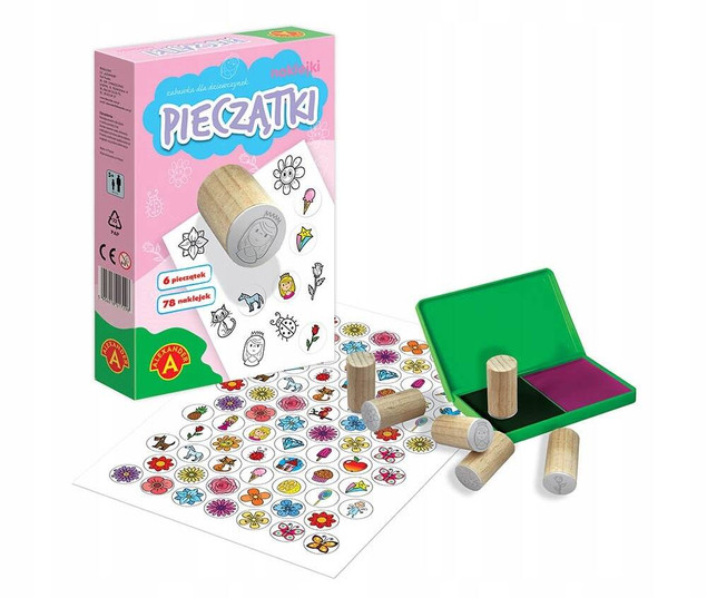 Zestaw kreatywny dla dzieci składający się z 6 pieczątek z ulubionymi motywami dziewczynek, które można odbijać na kartce czarnym i czerwonym tuszem z poduszek znajdujących się w specjalnym, plastikowym pudełku. Nowoczesny sposób obróbki gumy przekłada się na wzory o bardzo szczegółowych detalach oraz wyjątkową dokładność z jaką są one odbijane na papierze. Odbite kształty można kolorować kredkami lub dodatkowo ozdabiać nimi swoje rysunki. 76 kolorowych naklejek urozmaica zabawę. Wszystkie elementy znajdują się w eleganckiej, funkcjonalnej wyprasce.
