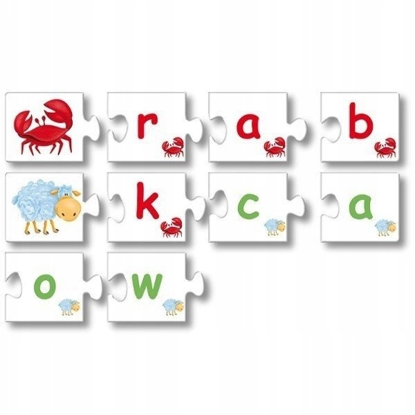 Zadaniem dziecka jest odnalezienie pięciu puzzli tworzących komplet (na który składa się obrazek oraz cztery litery w jednym kolorze) oraz ułożenie ich we właściwej kolejności. Ta prosta układanka edukacyjna sprawi, że pierwsze próby czytania będą dla dziecka świetną zabawą!