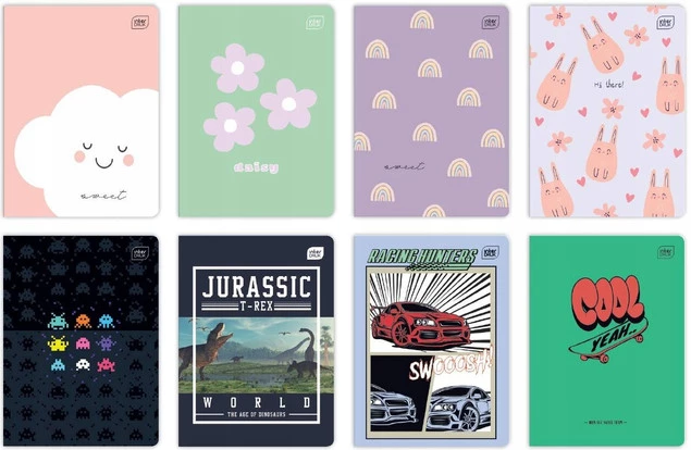 Format: A5. Liczba kartek: 16. Zadruk w kolorową trzylinię. Zaokrąglone rogi. Okładka pokryta lakierem UV. Ściąga z podstaw ortografii na odwrocie zeszytu.