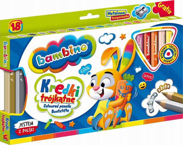 Kredki Trójkątne Szkolne Grube 18 Kolorów Temperówka Bambino