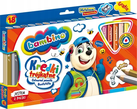Kredki Trójkątne Szkolne Grube 18 Kolorów Temperówka Bambino_1