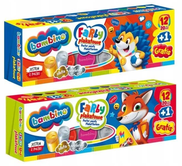 Farby Plakatowe Szkolne 12 Kolorów Złota i Srebrna +1 Cielista 20ml Bambino