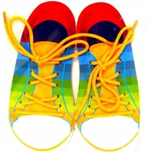 - Skład zestawu Dwa tekturowe buciki oraz sznureczki do nauki wiązania butów.