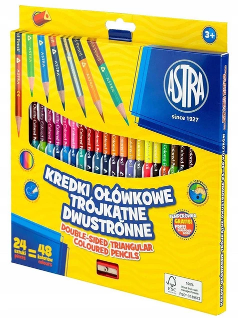 Kredki Trójkątne Dwustronne Ołówkowe 24=48 Kolorów +Temperówka 3+ Astra